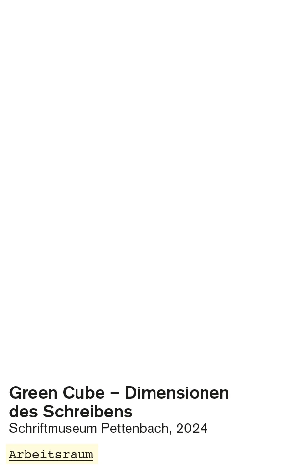 Für die Präsentation in der Stube installieren wir als Orientierungs- und Startpunkt einen signifikanten All-Over-Bereich aus grünem Tafellack. Es entsteht ein Green Cube, der für Ausstellungen bereitsteht und die Besucher:innen zum Mitmachen einlädt. Die Bezeichnung bezieht sich auf den klassischen, neutralen Ausstellungsraum – den White Cube.
