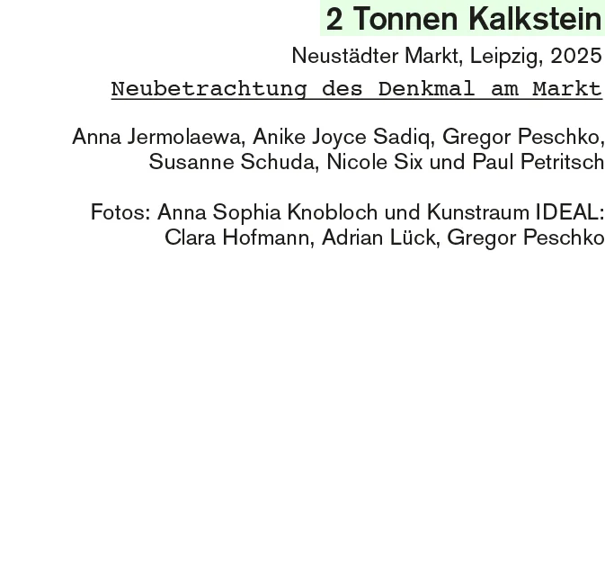 Das Programm findet in Zusammenarbeit mit verschiedenen lokalen Akteur:innen, dem Pöge-Haus e.V. und der Heilig-Kreuz-Kirche, Stadtkuratorin Leipzig – dem Programm für Kunst im öffentlichen Raum, der Kuratorin und Wissenschaftlerin Dr. Gülşah Stapel und weiteren Expert:innen statt. Im Laufe des Projektes „2 Tonnen Kalkstein“ entsteht mit Nicole Six und Paul Petritsch eine Publikation zum Denkmal, in die neben der umfassenden Archivrecherche auch Impulse und Diskussionen aus der Ausstellung und den Veranstaltungen mit einfließen.