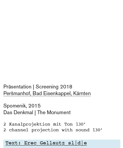 The video installation can be interpreted as a combination of several spacing processes: the positioning of the project in the exhibition space, the representation of the site of the monument (marked by its pedestal), and the circulation of the sculpture on Carinthian ground. Recording production conditions helped determine the aesthetics of the video installation: Both videos are the result of a continuous shot whose length corresponds to the duration of the journey. They are unedited and shown synchronously in a loop. In this way, the movement of the monument can be experienced as an ongoing, potentially endless process, while the pedestal, which is left behind for the time being, has a confusing and contemplative effect.