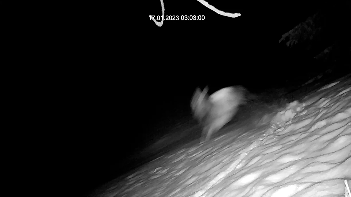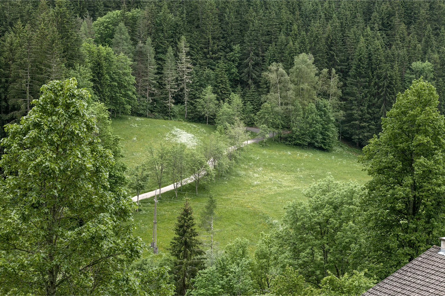 In their video “05-01-2023 (Pečnik-Wiese/Pečnikov travnik)”, Six & Petritsch present the recordings of four wildlife cameras that had been installed in the surrounding area of the Pečnik-Wiese/Pečnikov travnik between January and July 2023, with one of them aimed directly at the meadow itself. These cameras are triggered by the presence of people, animals, the wind, movements, light reflections, and weather phenomena and will then record at the duration of one minute. The generated one-minute recordings of a position are put one after another, unedited, resulting in an almost two-hour video. There is no way to predict what will be seen in those one-minute videos. They represent a strange overlapping of something that is simultaneously visible and hidden: visible because it has occurred before the camera (though we cannot always tell what has actually occurred), and invisible because the vast majority of the recordings have been “seen” by no one but the camera itself. As in the oral handing-down of field names, this too is the case of a form of knowledge being generated and passed on for which there is hardly any public or more than regional attention. The “hidden life” of the Pečnik-Wiese/Pečnikov travnik is added to the existing assemblage of cooperation with it.