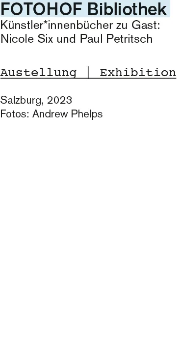 Nicole Six and Paul Petritsch have been realizing films, photographs, displays, artist books as well as site- and context-specific installations and projects in public space since 1997. They live in Vienna.