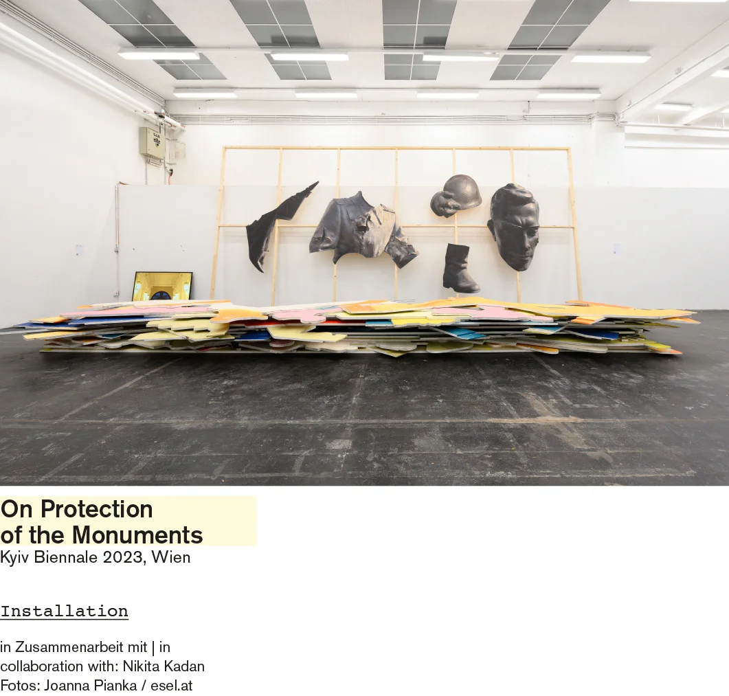Denkmäler aus der Sowjetzeit und die politischen Entwicklungen in der Postsowjetzeit stehen im Fokus des Interesses von Nikita Kadan. Seine Installation für die Kyjiw Biennale basiert auf dem Foto eines Hostomel-Soldaten: einem mit anderen Figuren des »Unbekannten Soldaten« vergleichbaren sowjetischen Monument, das der Erinnerung an die Befreiung vom Faschismus gilt. Obwohl sich die russische Propaganda immer wieder auf Letzteres beruft, wurden viele dieser Denkmäler in der Ukraine durch die kriegeri-schen Angriffe zerstört. Der Hostomel-Soldat verkörpert für Kadan die paradoxen Beziehungen zwischen der »faktischen« Kriegsvergangenheit, den wechselnden Ideologien und Formen des Gedenkens sowie dem Anspruch eines »Denkmalschutzes«, der sich in die Auslöschung der Erinnerung verkehrt.