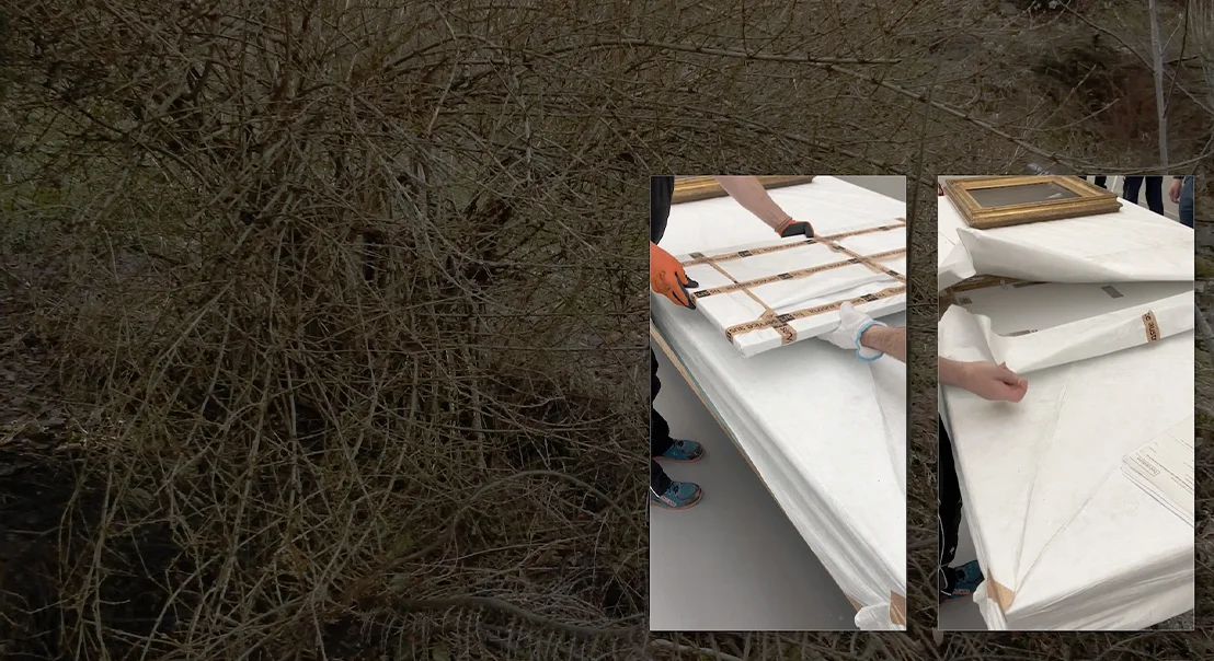 In order to connect the various strands of the narrative between the Salzkammergut, the place of origin of the paintings and the exhibition venue at Lentos in Linz, Nicole Six and Paul Petritsch illustrate how the exhibition came about within a film project: on the one hand, they film the places that appear in the historical narrative, and on the other, they document the journey of specific paintings from the lending institutions to the museum in Linz, their transport and handling up to the exhibition. In the exhibition, the films are presented on monitors next to the paintings and their labels with descriptions and the historical narrative, thus providing an insight into the making-of the exhibition.