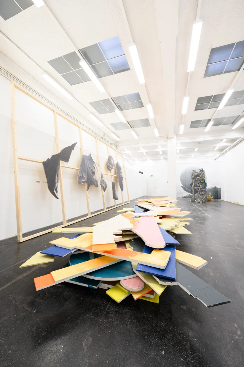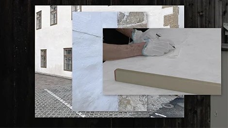 Six and Petritsch work with chalk-based paint, loosely applied, referencing lime – the core material of the monument. The paint symbolizes an altered, ephemeral form of monumentality. It also recalls the wall paint of the exhibition space. As visitors walk across the surface, the material spreads outward and loses its form – expanding, dissolving – until it is renewed again.