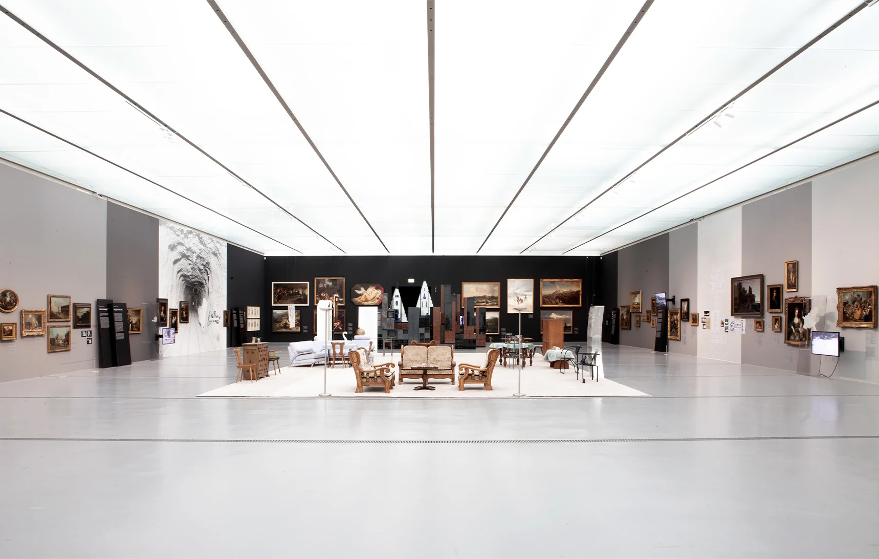 In der Gestaltung des Ausstellungsdisplays arbeiten Six & Petritsch gegen den nationalsozialistischen Kanon, der durch weiße Wände, Achsen und überhöhende Präsentationsformen geprägt war. Resultat ist ein allumfassender panoptischer Rundumblick, der dem Warburg’schen Verständnis eines Bilderatlas folgt: Auf farbschattierten Wänden wechseln ein Netz von Gemälden in Petersburger Hängung mit Bildtiteln, Provenienzketten, gelehnten Wandelementen und Monitoren. Dieser Rundum-Blick verknüpft mit kritischer Distanz die Werke mit
