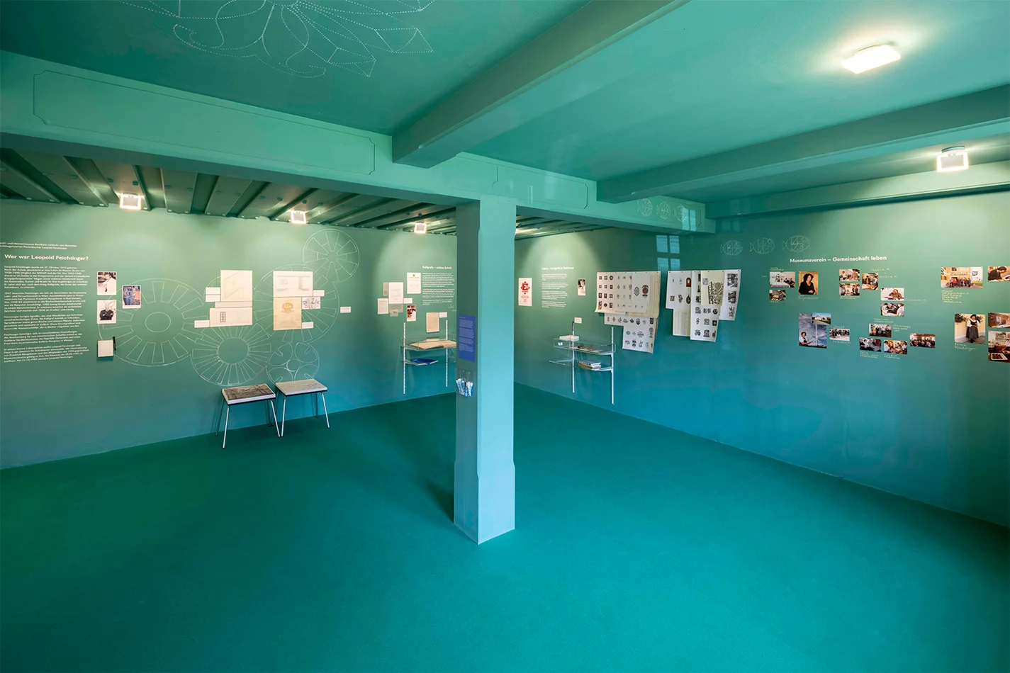 Für die Präsentation in der Stube installieren wir als Orientierungs- und Startpunkt einen signifikanten All-Over-Bereich aus grünem Tafellack. Es entsteht ein Green Cube, der für Ausstellungen bereitsteht und die Besucher:innen zum Mitmachen einlädt. Die Bezeichnung bezieht sich auf den klassischen, neutralen Ausstellungsraum – den White Cube.