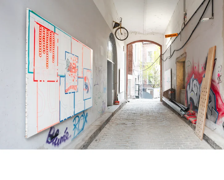 The central element is a series of posters based on an "imprint" of the original lettering "Versuchsanstalt" at the WUK-Mittelhaus. The typography reflects the architecture of the WUK, it runs around the corner, up and down stairs or seeks a perspective vanishing point. The posters are a guidance system, announcer, work material and exhibition space in the WUK as well as in the extended urban space at the same time.